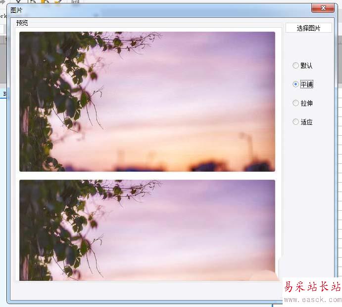 3、導入外部圖片,然后分別選擇默認、平鋪、拉伸和適應幾種方式,如下圖所示: