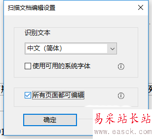 3、點擊圖中右下角掃描文檔下的“設置”,在彈出的窗口中勾選“所有頁面均可編輯”,點擊確定,再點擊編輯圖像時,就可以全篇識別了。