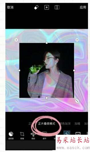 3、在混合模式功能中選擇“正片疊底模式”(注意如果想完全透明,不建議用顏色過深的主圖,盡量選擇白色背景,才能夠達到背景也重疊夢幻的效果)