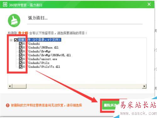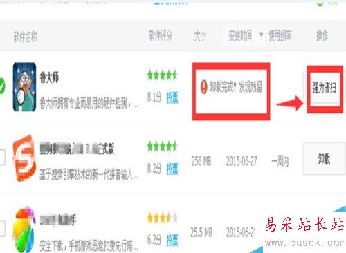 360軟件管理提示,卸載完成,發現有殘留,再點一下強力清掃。