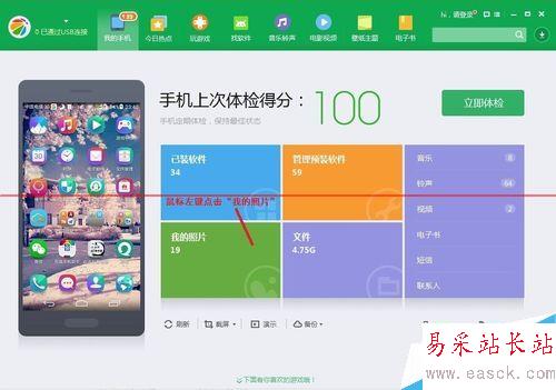 4、在360手機助手電腦版的界面中用鼠標左鍵點擊“我的照片”,進行手機中照片的管理。