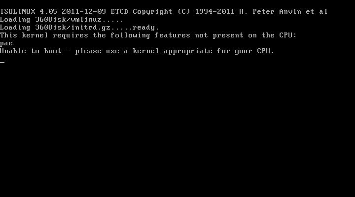 這是由于您的CPU無法被內核支持導致的,360急救盤暫時無法支持PAE模式的CPU,因此PAE模式內核的CPU將無法使用360急救盤引導。