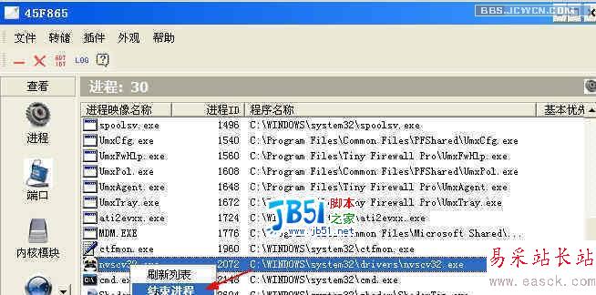 熊貓的特點之一是:關閉應用程序窗口。見到過不少中招后不知如何下手殺毒的帖子。如果你手頭有IceSword,可以這樣下手制服熊貓: