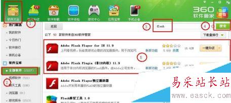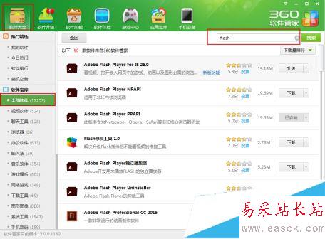 7. 在打開的軟件管家中,我們搜索flash,可以看到【adobe flash player for IE】以及【adobe flash player Plugin(非IE內核)】這兩個軟件