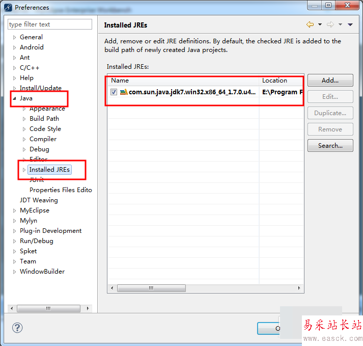 5、在左側找到java 下的InstalledJREs選項 可以看到右側的是MyEclipse的自帶的默認JDK