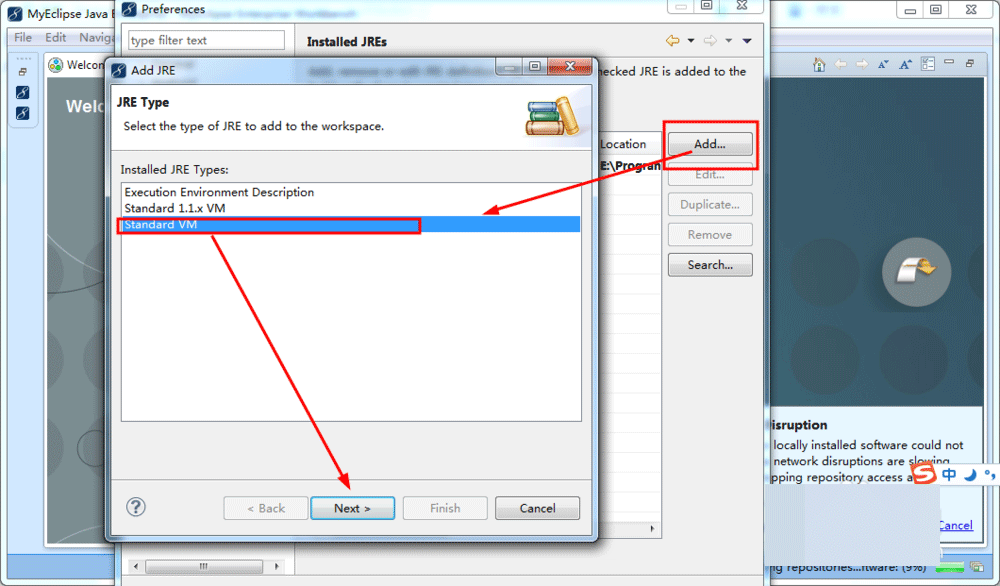 6、然后點擊Add 添加JDK 如圖 選擇Standard VM 然后點擊Next