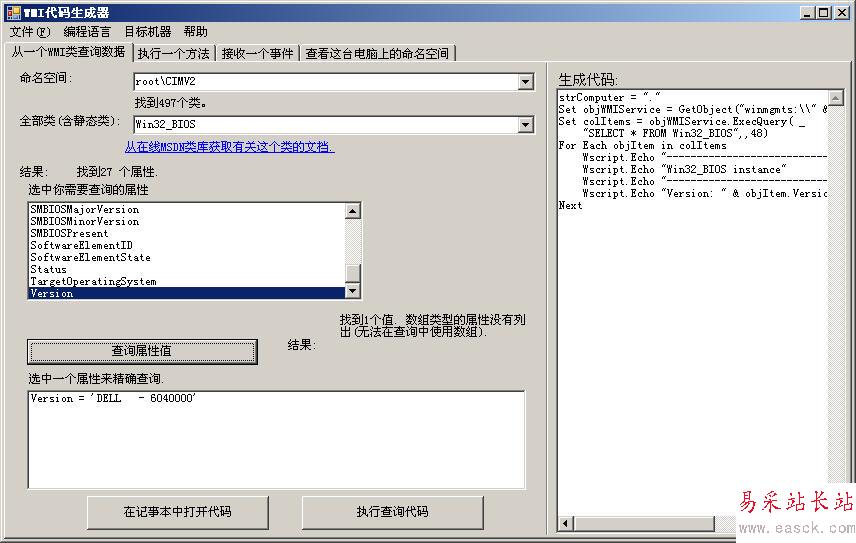 利用WMI代碼生成器可以執行查詢或者執行一個方法等,還可以查看當前或者遠程電腦上的命名空間以及其下的類,并且還可以生成相關的代碼(不然就不叫WMI代碼生成器了),支持生成的代碼類型包括VBS、C#及VB.NET,默認生成的代碼是VBS。