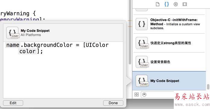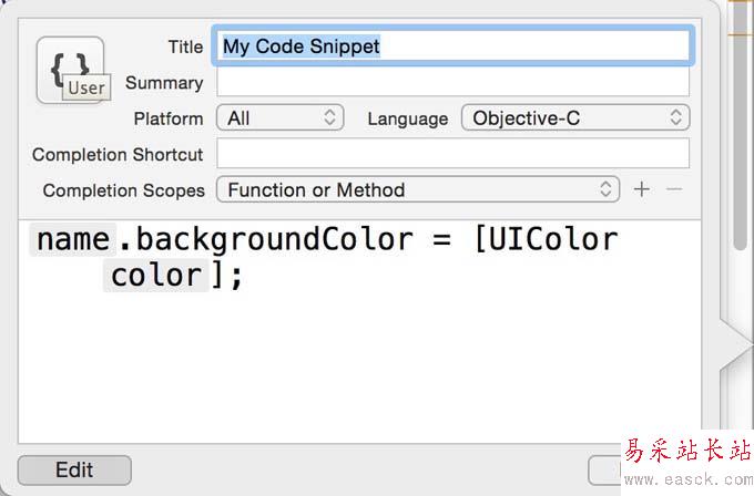 “Title”是這個代碼塊的標題,可以簡單寫幾個字,比如“設置背景顏色”;“Summary”是一個概括描述,可以不填;“Platform”中設置此代碼塊的作用的平臺(All/iOS/OS X/watchOS);“Language”是對應的語言,有很多中可以選擇;“Completion Shortcut”是此段代碼塊的快捷代碼,在編寫代碼時只要打出快捷代碼就可以直接使用這個代碼塊,比如設置背景顏色的代碼可以填寫“bgcolor”;“Completion Scopes”是該代碼塊的生效區域,可以默認。填寫完畢后點擊“Done”即可。
