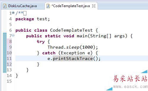 5、在Eclispe中新建一個Java源文件,然后輸入tsleep,編輯器會自動替換成: