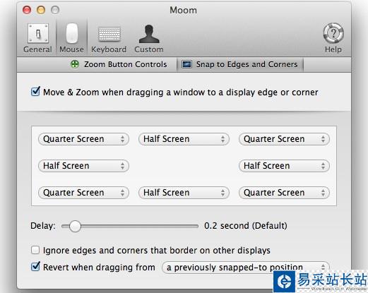 3. Moom 兼具了 Cinch 的看家本領,即拖動窗口至相應位置(Screen)快速變換其layout,Screen有三種,分別是Quarter,Half 和 Full,比如將窗口拖動到屏幕右上角時,就到了Quarter Screen的區域,松開光標后窗口layout就會改變咯。