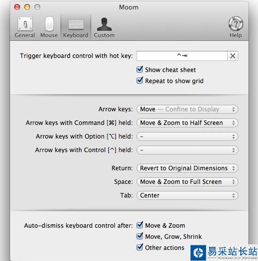 4.像 Moom 這種神器,沒有Hot Key的捧場絕對不能算完美的,實際上她的熱鍵才是真正的殺手锏,在 Settings-Keyboard里預先設置好熱鍵的功能,接著在當前窗口按下 Trigger Key 就可以彈出以下界面。
