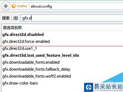 5、看到第一條,gfx.direct2d.disabled,它的值默認為disable,右鍵點擊它,然后點擊"切換",值變為true即為成功了