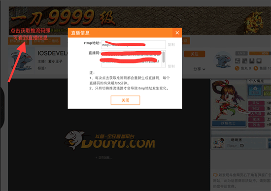 3、這個時候點擊獲取推流碼,即可看到rtmp地址和直播碼,將其填入OBS中串流的設置中。
