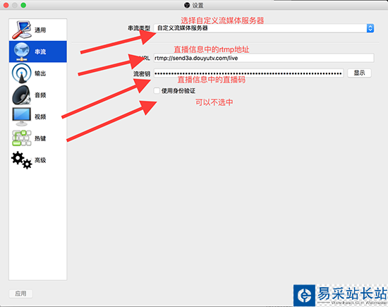 串流類型選擇自定義流媒體服務器,下面的URL和流密鑰需要根據直播間中的直播信息進行填寫,登陸斗魚賬號,點擊用戶名--->個人中心--->主播相關--->直播設置--->進入直播房間,然后可以看到下圖: