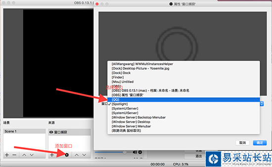然后選擇需要直播的窗口,這個時候可能里面沒有我們要直播的窗口,比如Xcode,這時,可能是我們沒有打開Xcode,打開Xcode之后,我們再,次打開OBS,讓其重新識別一次窗口,這時就可以選擇Xcode了,選擇完之后,點擊確定。