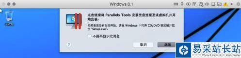 接著會彈出會加載一個 Parallels Desktop 的驅動光盤到虛擬機,一般情況下會自動彈出并安裝。點擊“繼續”按鈕。