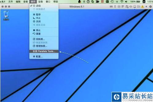 當我們在 Parallels Desktop 里安裝完成虛擬機系統以后,接下來請點擊頂部的“操作”菜單里的“安裝 Parallels Tools”選項。