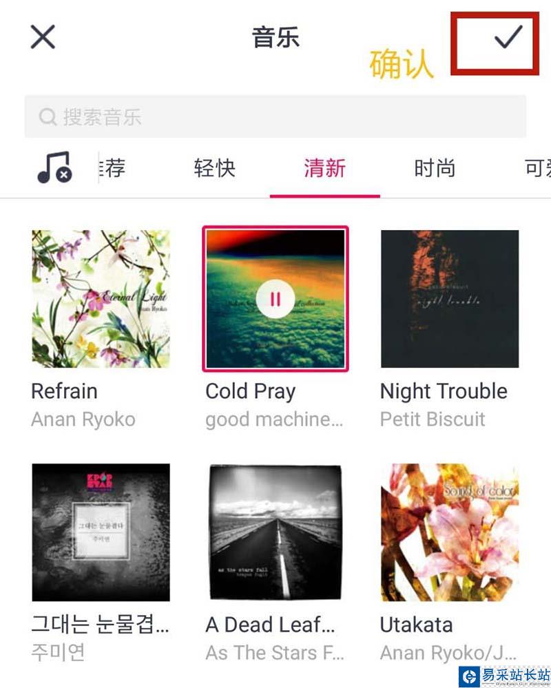 5、視頻拍好了,配一首歌更加有意思呢。點(diǎn)擊左上方的【音樂(lè)】,選好歌曲,確認(rèn)就行了,如圖所示。
