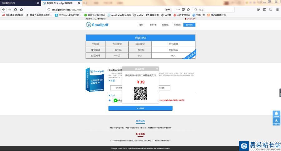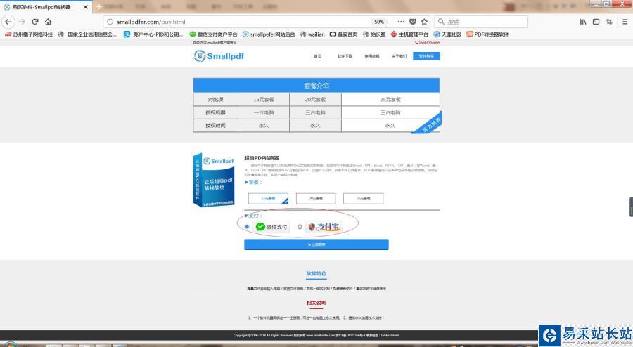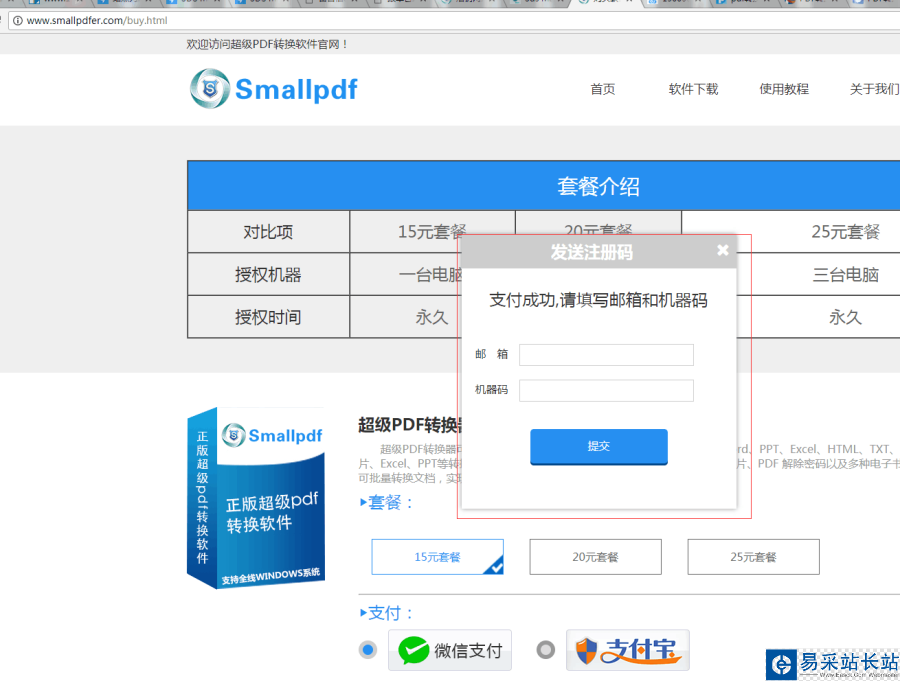 1.點擊【官網地址:smallpdfer.com】,進入超級PDF轉換軟件官方網站,選擇支付方式進行支付。支付成功后提交購買者的正常使用的郵箱與軟件機器碼(一臺電腦的軟件機器碼對應唯一注冊碼)。