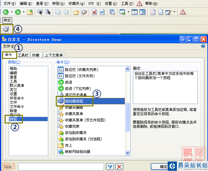 3. 如圖3,點擊“命令”標簽(①),在下方的列表框中選擇“轉(zhuǎn)到”(②),再在右邊的列表框中選擇“驅(qū)動器按鈕”(③),然后在驅(qū)動器按鈕上按住左鍵,把“驅(qū)動器按鈕”拖到上一步剛建立的空白Toolbar上(④)。此時Toolbar上出現(xiàn)了一個軟盤、光盤、硬盤三合一模樣的圖標,點擊確定退出。