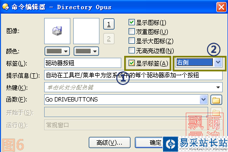 6. 如圖6,在彈出的“命令編輯器”中勾選“顯示標簽”(①),并在右邊的下拉框中選擇“右側(cè)”(②),點擊確定,再點擊“自定義”對話框的確定退出。