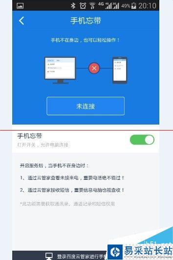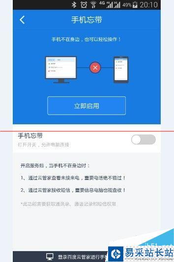 3、配置百度云手機端軟件。請登錄到百度云,并點擊:發現 》手機忘帶。點擊開啟。