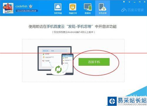 4、配置百度云電腦端軟件。請登錄到百度云,切換到手機忘帶,點擊:連接手機。
