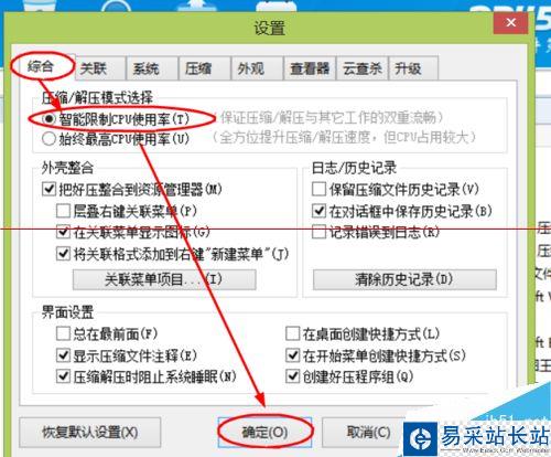 3、在【設(shè)置】界面下,點(diǎn)擊選擇【綜合】--【智能限制CPU使用率】--【確定】選項(xiàng)完成設(shè)置。(如圖所示)