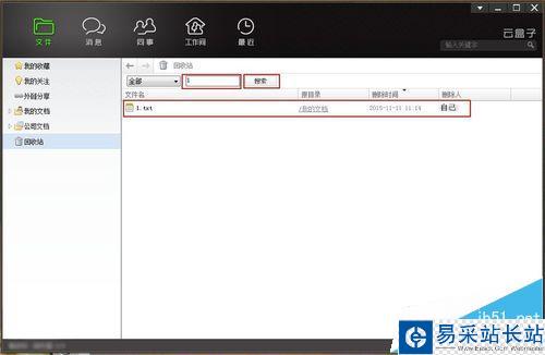 1、打開云盒子客戶端,在左側選擇回收站,右側則會直接顯示曾經刪除過的文件(非管理員只能看到曾經在我的文檔里的文件)。
