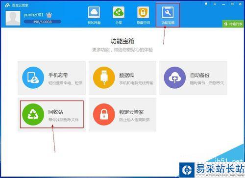 1、打開百度云管家,點擊功能寶箱,點擊回收站,會彈出百度云的網頁。