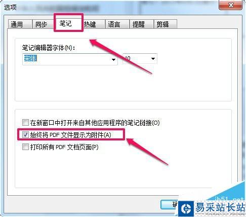 2、修改筆記選項.在【選項窗口】,依次選擇[筆記]。在[筆記]中,您會看到[始終將PDF文件顯示為附件],就是它了,您只需在這句話前面打勾即可。