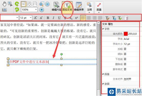 5、當然,如果你對PDF文件內容還有需要編輯添加的,也是可以添加的,點擊“添加文本”,然后就可以在方框里輸入文字,而且輸入的文字可以進行文本屬性的設置。真的是比較方便。