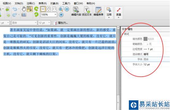 4、PDF文件中的內容選中后,我們可以看到其文本屬性,這些都是可以進行編輯修改的,我們還可以根據頂部的功能任務欄進行操作。