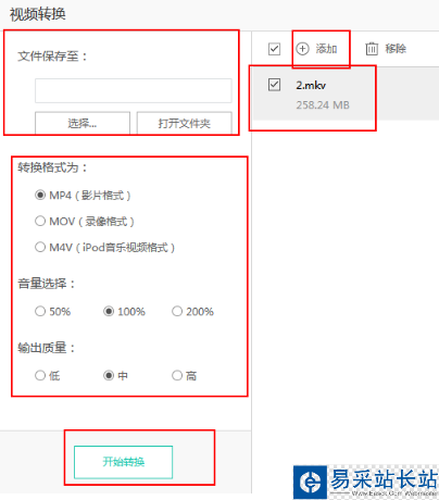3、之后再設置一下轉換后視頻的存儲位置、轉換格式、輸出質量等,設置完畢后點擊“開始轉換”就可以了。