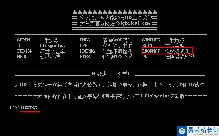 2.進(jìn)入到DOS工具菜單,我們需要運(yùn)行的是低級(jí)格式化工具,因此,只需要在下方輸入“lformat”后按回車鍵確認(rèn),如下圖所示