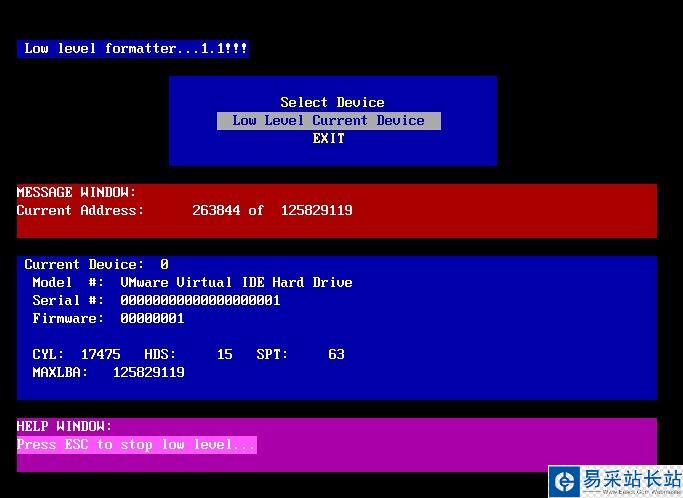 6.進(jìn)行低級(jí)格式化時(shí),我們可以隨時(shí)按下“ESC”鍵退出,但是數(shù)據(jù)也會(huì)被刪除,等待低級(jí)格式化完畢后按下Ctrl鍵+Alt鍵+DEL鍵重啟計(jì)算機(jī)即可。如下圖所示