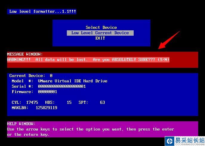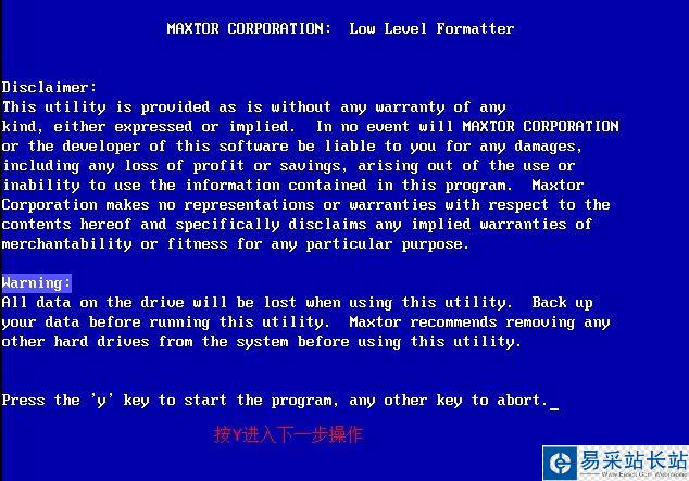 5.這邊會(huì)提示是否確定繼續(xù)操作,繼續(xù)操作低級(jí)格式化后會(huì)將原有的數(shù)據(jù)全部刪除,并且無法修復(fù),我們按“y”繼續(xù)操作。如下圖所示