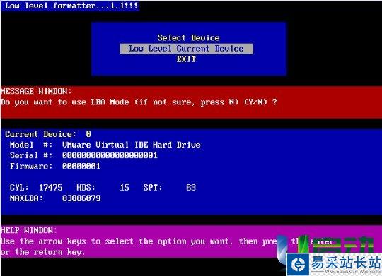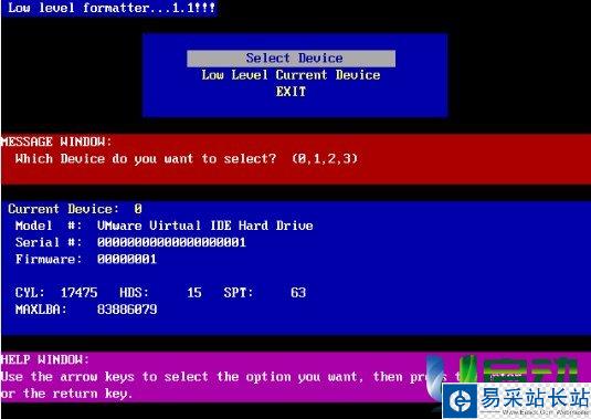 這時我們需要選擇進行低級格式化的磁盤,將光標移至“Select Deveice”后按下回車鍵便會在下方出現提示;如下圖所示:
