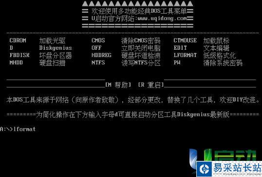 運行DiskGenius分區工具,進入到DOS工具菜單后,我們需要運行的是低級格式化工具,因此,只需要在下方“A:/>”的后面輸入“lformat”后按回車鍵確認即可;如下圖所示: