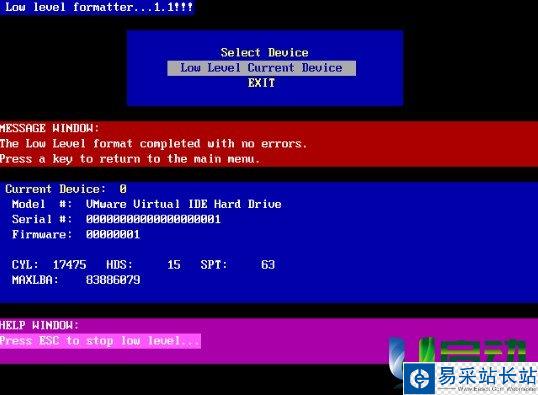 在進行低級格式化時,我們可以隨時按下“ESC”鍵退出,但是數據也會被刪除,等待低級格式化完畢后按下“Ctrl+Alt+DEL”重啟計算機即可;如下圖所示: