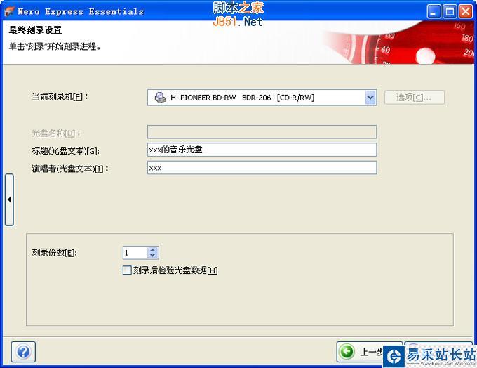 進(jìn)入“下一步”,如圖,選擇刻錄機的位置,設(shè)置標(biāo)題(光盤文本),演唱者(光盤文本),刻錄的份數(shù),還有刻錄后是否檢驗光盤數(shù)據(jù)。