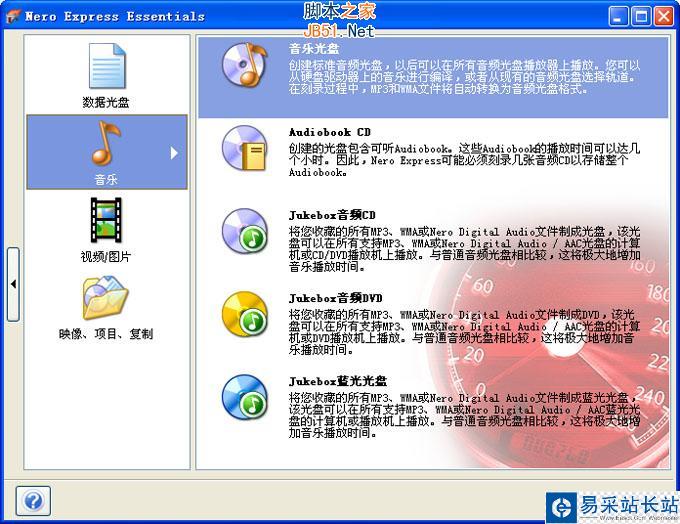 首先選擇NERO-音樂-音樂光盤,進(jìn)入添加音頻的界面!還有Adiobook CD,Jukebox 音頻CD,Jukebox 音頻DVD,Jukebox藍(lán)光光盤等,都有簡單的功能介紹,這是就不一一講了。主要講音樂光盤的CD刻錄!