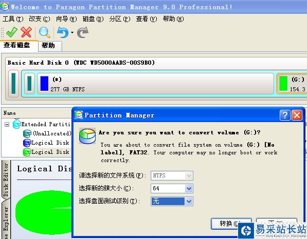用pq魔法分區師可以方便的對硬盤進行文件轉換。方法如下