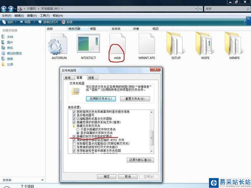第二步、下載文件。到http://www.survivalescaperooms.com/softs/43379.html,解壓縮后,把文件夾里的所有文件復制到移動硬盤主分區根目錄下: 第三步、復制文件。然后打開WXPE文件夾,把里面的兩個文件復制到根目錄下: 第四步、改名。打開工具欄里的文件夾選項,將查看里的隱藏文件類型的擴展名前面的鉤點去,顯示文件的擴展名。再將剛才復制到根目錄下的SETUPLDR.BIN改成ntldr(注意連擴展名一起改)。 第五步、修改引導設置。重新啟動計算機,進入BIOS,找到計算機引導設置,將移動硬盤設為第一引導。