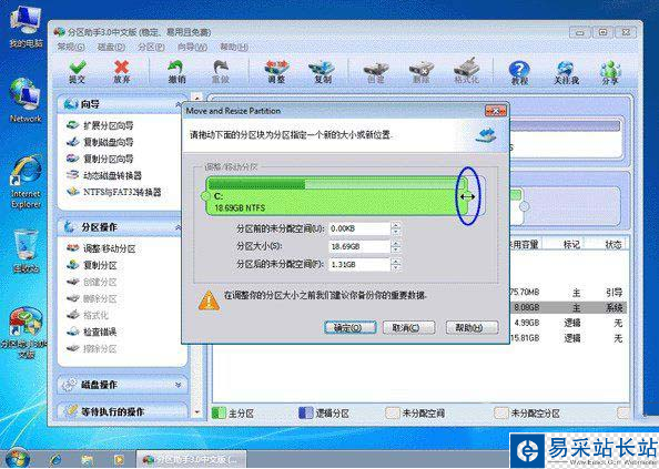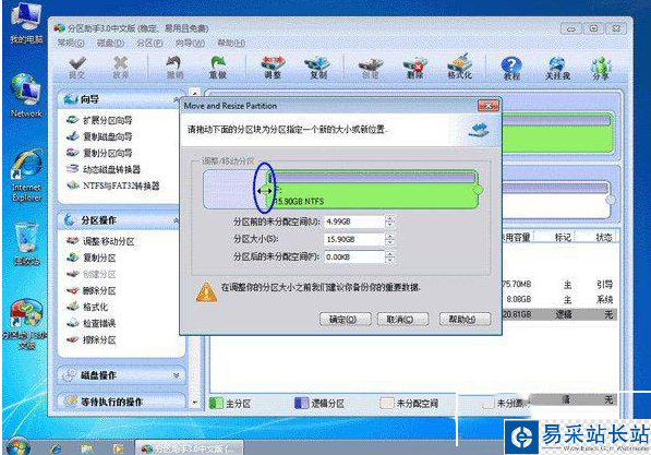 5、分區助手怎么用?第五步、然后將出現一個彈出的窗口,向右拖動右邊的手柄直到C盤被調整到20GB。