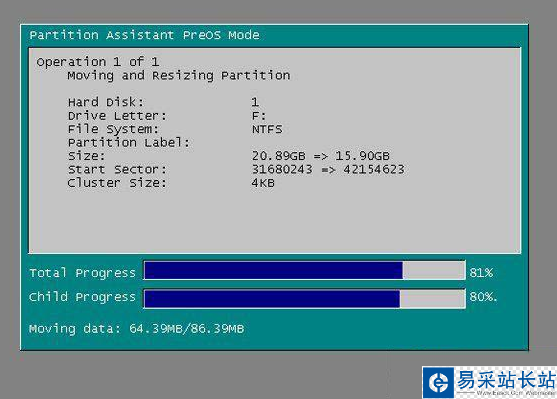 8、在點擊執行后,分區助手可能會提示你重啟電腦在重啟模式(PreOS Mode)下執行這些操作,這時點擊“是”以在重啟模式下執行,但重啟模式是英文的界面,下圖是分區助手在重啟模式下的執行狀態: