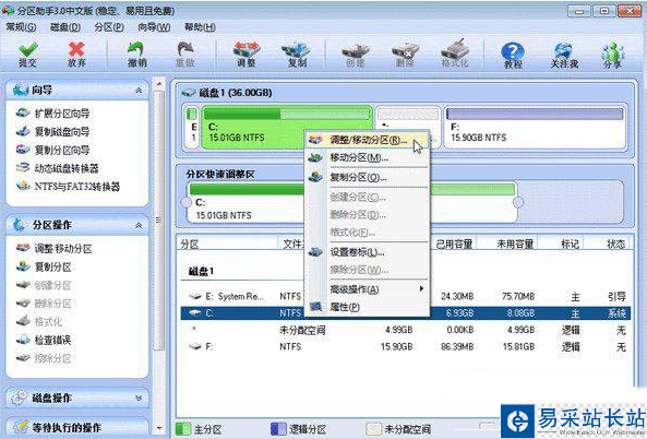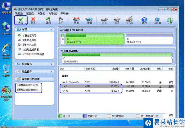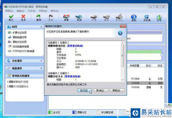 6、點擊確定后,返回到主界面。看列表框中,這時C盤的大小為20GB,同時F盤的大小調整為15.90GB了。在主界面的左側的“等待執行的操作”中你可以看到有兩個需要執行的操作:一是調整并移動(F:)分區,二是調整(C:)分區的大小。