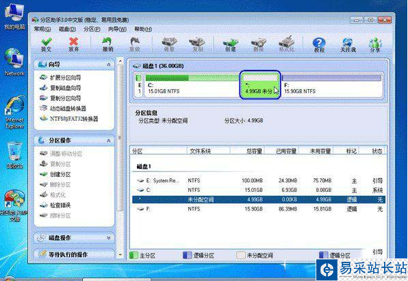 3、在點擊上圖2的確定之后將返回到主界面,同時你將看到C盤后面多出一塊大小為4.99GB的未分配空間。