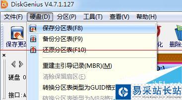 2、接著點擊“硬盤”菜單項,從彈出的下拉菜單中選擇“保存分區表”項,以實現保存當前分區表信息。