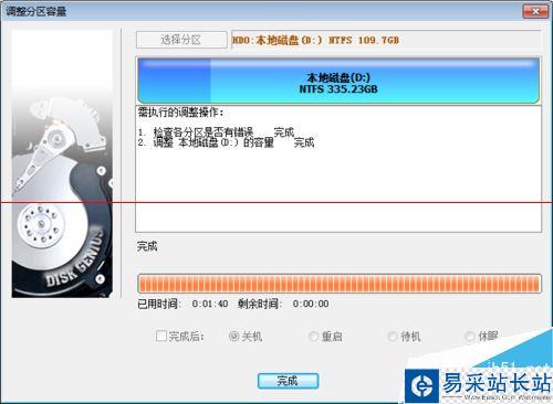5、將下來“DiskGenius”工具將檢測分區的錯誤,同時完成兩個分區的合并操作。如圖所示,最后點擊“完成”按鈕。